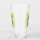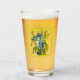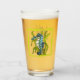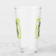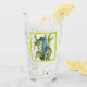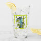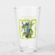 This glass tumbler for beverages has a fantasy sea dragon creature who is aqua blue and white with its tail wrapped around seaweed inside a wavy light green border.