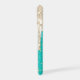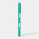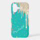 This glamorous phone case has a background deep aqua blue with tiny silver and gold star bursts. The top is covered with silver faux glitter drips. Your name is in white script diagonally across the bottom. Pretty!