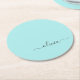 Aqua Blue Teal Modern Script Girly Monogram Name Round Paper Coaster