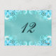 © Sunny Mars Designs - Floral Hibiscus: Dark Aqua Blue or Turquoise Wedding Table Number Cards - Beautiful, designer custom wedding reception table number card template with a modern, elegant illustration of a pretty, classy aqua blue swirly hibiscus floral decoration against a teal background.