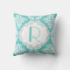 Aqua blue, white damask pattern throw/toss accent decorative pillow with monogram in a grey frame.