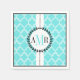 Aqua blue, white quatrefoil pattern wedding paper napkin with initial and monogram, featuring a modern Moroccan lattice trellis pattern, a white stripe from top to bottom of the napkin, a dotted line over it and your initials and monogram in a frame with a black branch wreath. There is a black border around it. This trendy and cute girly monogrammed paper napkin is perfect for other special occasions too such as bridal showers, birthday parties, baby showers, anniversary party, engagement, reception etc.