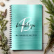 This personalized recipe notebook features a monogram and first name in modern black and white script on an aqua faux brushed metal background, with the additional text in black sans serif font below.