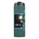 Thermal tumbler design features aqua and black checkboard background, luminescent white rose floral bouquet and customisable name.