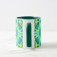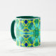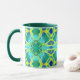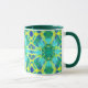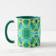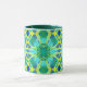 Mug in a tie dye pattern in shades of cobalt blue, green and yellow with an aqua / seaglass green background