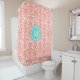 Customisable monogram classic elegant floral damask pattern shower curtain in peach coral pink, light turquoise aqua blue and white.