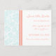 Wedding save the date announcement postcards in elegant and contemporary bright pastel light turquoise sky blue, peach orange pink, and white classic and vintage floral damask pattern, stylish and fully customisable with your wedding details. Also available in many other products for the wedding party.