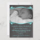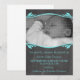 Sweet and whimsical Elegant Chalkboard Photo Baby Announcement in turquoise featuring a simple vine and leaf design framing the photo area. Customise this lovely announcement with a photo of your bundle of joy and all the exciting details! Click "Customise It" to find more personalisation options.