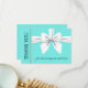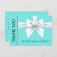 Aqua Elegant Tiffany Teal Fancy Baby Shower Thank You Card. Show your appreciation for your guests with this elegant flat thank you card. The perfect aqua blue with pearls and a white bow paired with modern script calligraphy and a trendy but classic typography finish it off with class. Go stylish with our tiffany baby shower theme invitations, stationery, decor and tableware!