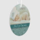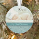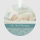 This holiday keepsake ornament features your own baby photograph, with a bottom border of elegant aqua blue floral swirl. A darker teal banner holds your customised text; make it say whatever you'd like! The back of the ornament has the same aqua floral swirl pattern and teal banner with additional text. This makes a nice keepsake gift for new parents.