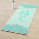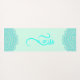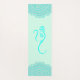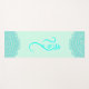 Pretty light mint coloured yoga mat, with graphics of an aqua mandala on both ends. An aqua symbol of Ganesha, decorates the middle. Same design is featured on both the front and backside of the mat.