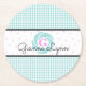 Aqua Gingham Monogrammed Round Paper Coaster