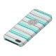 Chic and modern iPhone 5c custom monogram case in elegant turquoise teal blue, grey, and white retro chevron zigzags stripes pattern.
