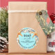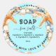 Aqua blue colour Homemade sea salt soap label with seashells coastal background design with elegant calligraphy font, space for your ingredients, and other details. Your Brand name with a statement made with love by (your name).
