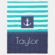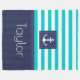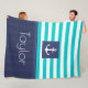 Nautical fleece blanket with turquoise & navy blue striped pattern and customisable text.