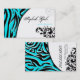 Promote your hip and cool party planner business with this aqua blue, black, and white modern and stylish rough textured zebra print, bold floral, and diamonds business card. This business card features a rough, textured zebra (animal) print background with a curved swatch adorned with gorgeous diamonds and bold, sassy floral swirls. This bold, modern, and stylish business card is also a great match for fashion designers, the music industry, singers, musicians, real estate agents, handbag designers, clothing stores, the entertainment industry, dancers, actresses, makeup artists, jewelery stores, jewelers, diamond sales, retail, cosmetologists, models, agencies, dance studios, party planners, event planners, and more. ©2011 Pam's Designs.