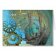 Fantasy digital graphic features a snail shaped Steampunk time travel machine with abstract aqua background