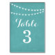 Cute, trendy aqua chalkboard summer string light wedding table numbers. These table numbers work well for rustic weddings! Check out the matching wedding invitations, save the dates, thank you cards and more! To change the font style and colour, click on the "Customise It" button below the product image for more personalisation options.