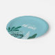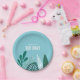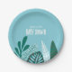 Tropical baby shower paper plate with tropical leaves in shades of aqua and green.