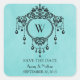 Elegant Vintage Chandelier Save the Date Stickers featuring a stylish hanging chandelier on a turquoise antique look background. The chic elegance of this design makes it perfect for announcing your sophisticated wedding. Easy to customise, add your wedding details and initial. Click "Customise It" to find more personalisation options.