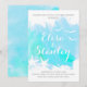 Modern abstract aqua blue watercolor splash with starfish and seagulls beach wedding couples shower invitation featuring a hand painted watercolor paint splash with texture in tones of aqua blue and turquoise, two starfish and seagulls in white and text in white and grey. This elegant and stylish casual wedding design is a completely customisable template perfect for your summer beach or destination wedding. Note that this is only an image of watercolor and not real texture. For best results choose paper with texture.