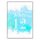 Modern abstract aqua blue watercolor splash with starfish and seagulls beach wedding table number place card featuring a hand painted watercolor paint splash with texture in tones of aqua blue and turquoise, two starfish and seagulls in white and text in white. This elegant and stylish casual wedding design is a completely customisable template perfect for your summer beach or destination wedding. Note that this is only an image of watercolor and not real texture.