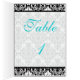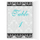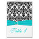 This black and white damask Table Number card has an aqua blue PRINTED ribbon and PRINTED diamond jewel brooch that would be perfect for an aqua and black themed wedding. **You MUST change the number 11's to each of the table numbers you need, add it to your cart, and then return and repeat the process until you have all the individually numbered cards that you need in your cart. ALSO, if you change fonts, or the size of the font, some of the design and/or text may get cut-off. Everything will print as you see it on your monitor. I will not see changes you make, and Zazzle will NOT correct anything (typos, mis-alignment etc.). The text is all customisable. You can select one of 2 sizes for the table number card. If you need help with this product, please email me BEFORE you place your order. If you require any other matching items, please email your request to niteowlstudio@gmail.com