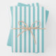 Coordinating gift wrap for all occasions. This is a simple stripes pattern in a aqua and white all-over print. There are two sheets with stripes and one solid aqua