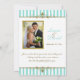 This chic and stylish aqua blue and white striped invitation style thank you card with gold accents is on basic white paper and has a spot for you to add your own digital wedding photo. The text and paper choice is customisable. There is also a greeting card style that does not have a photo template on it, if you prefer that. If you require any additional matching items, please email niteowlstudio@gmail.com with your request.