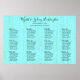 Rustic wood look seating chart poster size 36 by 24 inches. Modern script at the very top for names of the bride and groom. Also include the date and location of celebration. More script font lists "Table One", etc. over aqua blue wood grain background. Choose any size and add guests names beneath their assigned table. Twelve sections with eight names each is the limit on this design. Remove text or text sections as needed. This design works for any rustic themed wedding.