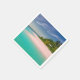 Paper napkins with a beautiful photograph. A scenic tropical beach with aquamarine water and a white sandy beach with a lush forest in the back.