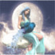 The astrology sign, Aquarius, is depicted as a pretty woman with light blue hair wearing a sea green dress sitting on a rock pouring water from a jug with a full moon behind her.