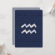A silver chrome like Aquarius Zodiac symbol on a navy blue print background. A modern urban racy design for a great custom birthday gift idea.