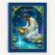 Journal in a celestial image of the Aquarius zodiac sign, featuring a man in ornate white robes with gold embroidery, kneeling beside a tranquil pool under the stars. He pours water from an intricately decorated golden urn under a starlit sky.