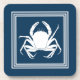 Aquatic themed design with crab decoration in striped squares on blue background