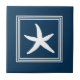 Aquatic themed design with starfish decoration in striped squares on blue background