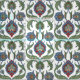 Arabesque ornate floral pattern in shades of olive green, cove blue and warm red. Leaves, stems, blossoms and forget-me-not style flowers. On white.