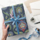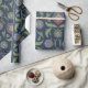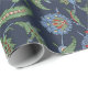 Arabesque ornate floral pattern in shades of olive green, cove blue and warm red. Leaves, stems, blossoms and forget-me-nots. On ebony clay blue background.
