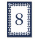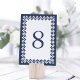 Modern Moroccan inspired table number cards feature a geometric border in navy blue and white surrounding your table number. Design repeats on reverse side. Coordinates with our Arabesque wedding invitation suite in Navy.