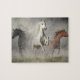 Three Arabian horses gallop out of the fog. The leader is white (technically a grey) followed by black and chestnut coated horses.