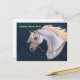 A reproduction image from an original oil painting of a Grey Arabian Horse wearing a show halter, displayed on a Postcard. -- Artwork is copyrighted by me, the artist.