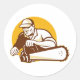 illustration of an arborist tradesman cutter holding a chainsaw viewed from front with sunburst and circle on isolated background