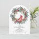 Arch-shaped invitations are one of the hottest trends in event planning. Fresh and novel, it will capture your guests' attention. An elegant red cardinal nestled in a winter greenery wreath invites guests to your winter or Christmas birthday party. The watercolor design features a beautiful cardinal and a pine wreath decorated with red flowers and berries along with pine cones.