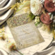 Art Deco Peacock Vineyard Die Cut Wedding Invitations - Gold Raspberry and Olive Green