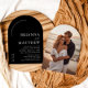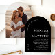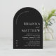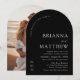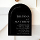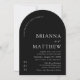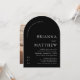 An elegant and stylish wedding invitation design featuring a modern arch layout in a sleek black and white minimalist theme. The invitation showcases clean lines and a sophisticated typography layout, using bold sans-serif fonts paired with subtle script accents. The arch serves as the centerpiece, with key wedding details such as the couple’s names and event date prominently displayed. The design emphasises simplicity and refinement, using high contrast and negative space to create a timeless and contemporary look. Perfect for couples seeking a modern and chic aesthetic for their special day.