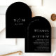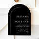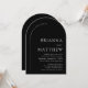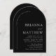 An elegant and stylish wedding invitation design featuring a modern arch layout in a sleek black and white minimalist theme. The invitation showcases clean lines and a sophisticated typography layout, using bold sans-serif fonts paired with subtle script accents. The arch serves as the centerpiece, with key wedding details such as the couple’s names and event date prominently displayed. The design emphasises simplicity and refinement, using high contrast and negative space to create a timeless and contemporary look. Perfect for couples seeking a modern and chic aesthetic for their special day.