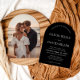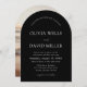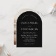 An elegant and stylish wedding invitation design featuring a modern arch layout in a sleek black and white minimalist theme. The invitation showcases clean lines and a sophisticated typography layout, using bold sans-serif fonts paired with subtle script accents. The arch serves as the centerpiece, with key wedding details such as the couple’s names and event date prominently displayed. The design emphasises simplicity and refinement, using high contrast and negative space to create a timeless and contemporary look. Perfect for couples seeking a modern and chic aesthetic for their special day.