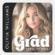 Black graduation stickers featuring your photo inside a half arch frame with white text overlay "grad" in a retro style font. Aligned vertically to the left is a template filed for the graduate's name.