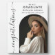 This contemporary style graduation tabletop plaque has a photo template that places your chosen vertical photo in a popular arch shape. Congratulations is written out in a handwritten script font with additional text that includes the name of the graduate and their school and graduating class year. This plaque is a great choice to have on display at a graduation party, or at home where you have your graduates gifts on display for family and friends to admire. Personalise the template with your graduate's photo, name, school, their graduating class year and you're all set!