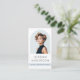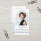 Modern, minimal, professional business cards or personal profile cards with your photo inside and arch shaped frame. Customisable name and title/company name on the front. On the back are customisable template fields for your contact information and QR code. White with light dusty blue accents. All colours are customisable in the design tool.